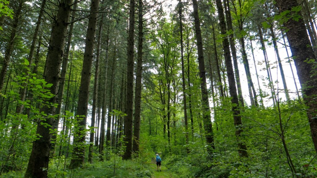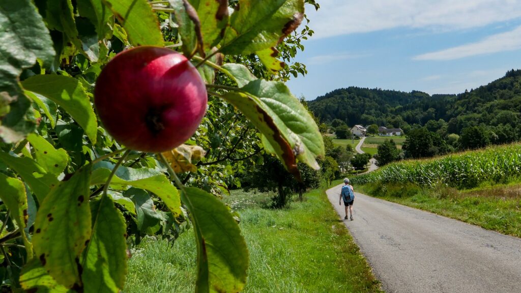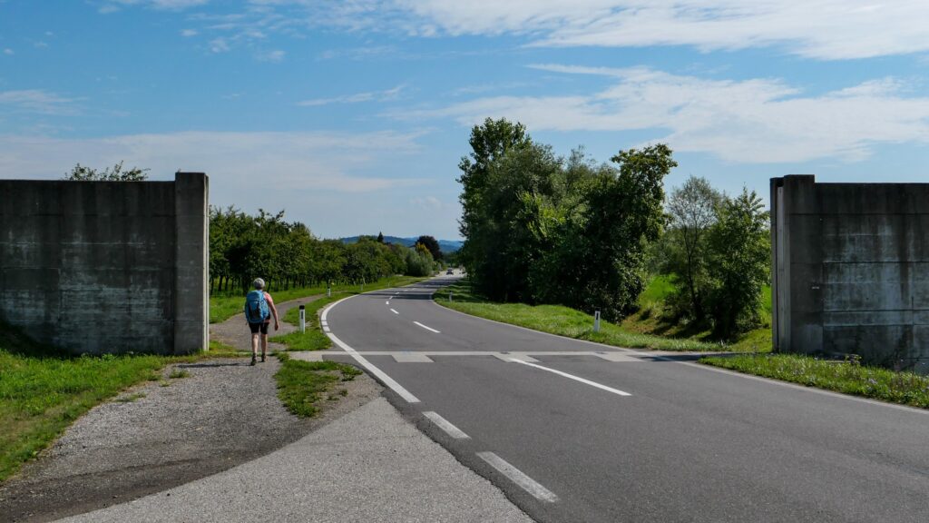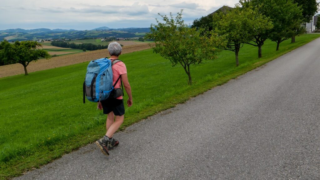 En attendant, il faut se mettre en route et, si possible, arriver avant les fortes pluies que la météo annonce pour le milieu d’après-midi. Le plan : marcher à bonne allure tant qu’on est dans la plaine, ne pas mollir quand le chemin s’élève, éviter les détours inutiles, suivre de près l’avancée de la masse nuageuse et, sur les hauteurs aux environs de Grein, choisir entre petite route qui nous y mènera directement ou continuer sur le chemin, plus long, et sa descente escarpée dans les bois. Nous verrons bien.