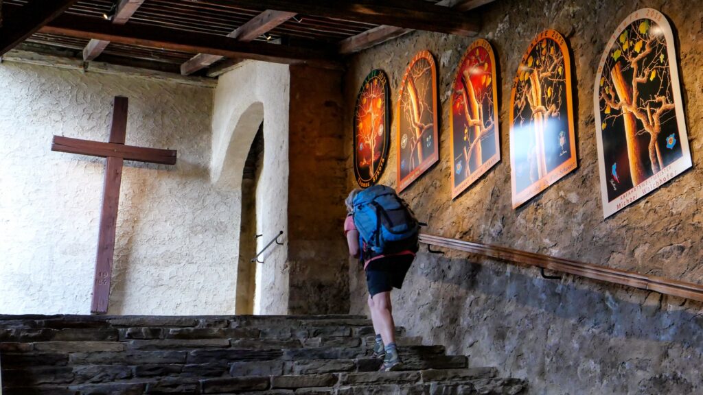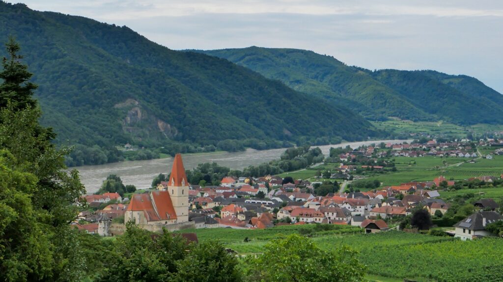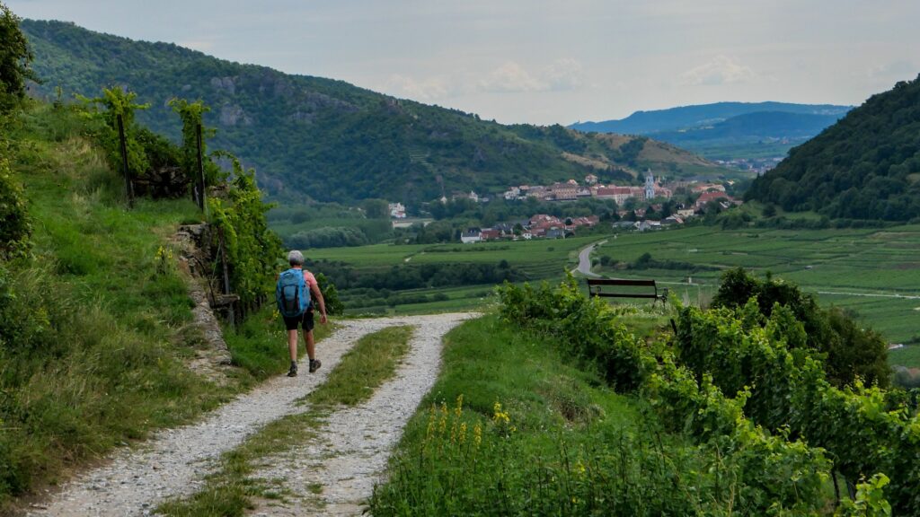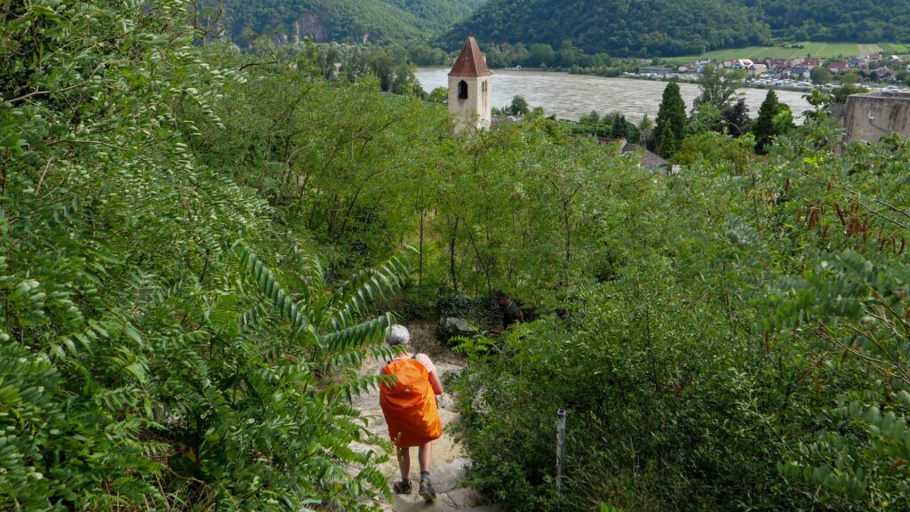 Aujourd’hui, nous parcourons le dernier grand méandre que le Danube fait dans le Waldviertel (littéralement le quartier de la forêt), cette région de granit et de forêts dont les contreforts dominent le Danube de plusieurs centaines de mètres. C’est notre plus longue étape (26 km), parmi celles incluant un dénivelé important. Elle est constituée d’un tronçon de 16 km à travers bois et reliefs jusqu’à la touristique cité médiévale de Dürnstein, célèbre pour son château, aujourd’hui en ruine, où Richard Cœur de Lion fut maintenu prisonnier par le duc Léopold V d’Autriche en 1192, si ma mémoire est bonne. Vous ne vous rappelez plus ?
