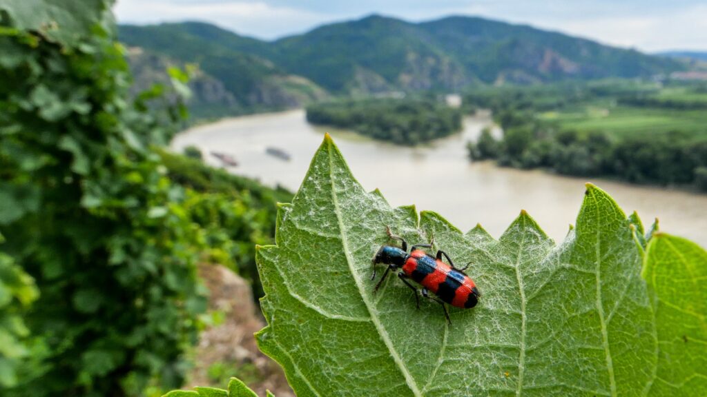 Revenons à nos moutons. Après Dürnstein, il reste une dizaine de kilomètres dans les vignes et le long de la voie ferrée jusqu’à Krems. C’est pas très dur, mais ça rajoute deux bonnes heures. Vu qu’on a décollé à 10:21:21, ça nous fait arriver à Krems vers 18h30. Ça va encore être tendu. L’idée de prendre le train ou le bus à Dürnstein commence à faire son chemin, d’autant qu’une pluie est annoncée en soirée, que je n’ai plus beaucoup de batterie (la lampe de poche avait décidé d’éclairer le fond de… ma poche). Profitant d’un chemin plat, je consulte les horaires. Un train toutes les 3 heures : le 15h30, ça va être juste. Un bus toutes les heures. Le 16:24 est jouable. Voilà, nous avons une option. Nous déciderons plus tard. En attendant, nous n’avons qu’à profiter une dernière fois de cet environnement exceptionnel. Et nous ne serons pas déçus ! Nous verrons un pauvre viticulteur équipé d’un pauvre masque FFP2 qui se déforme au gré de sa respiration, traiter ses pauvres vignes avec un pauvre pulvérisateur à moteur, avec sa pauvre femme sans masque qui vaque deux pauvres rangs en dessous. L’odeur du « phytosanitaire » associée au gaz d’échappement est tout simplement divine. Vite, barrons-nous d’ici. Heureusement, la nature nous réserve quelques belles surprises, telle cette biche qui broute paisiblement sur notre chemin ou, plus extraordinaire encore, une petite chauve-souris endormie sur une grande bardane. « C’est pas normal, elle a pas la tête en bas ! ». « Mais Mireille, répondis-je doctement en sortant mon appareil photo, ce n’est pas parce que les chauves-souris dorment généralement la tête en bas que toutes les espèces dorment la tête en bas. Il y a peut-être des espèces arboricoles, comme celle-là par exemple ». « Ouais, peut-être, mais c’est bizarre quand même ! ».