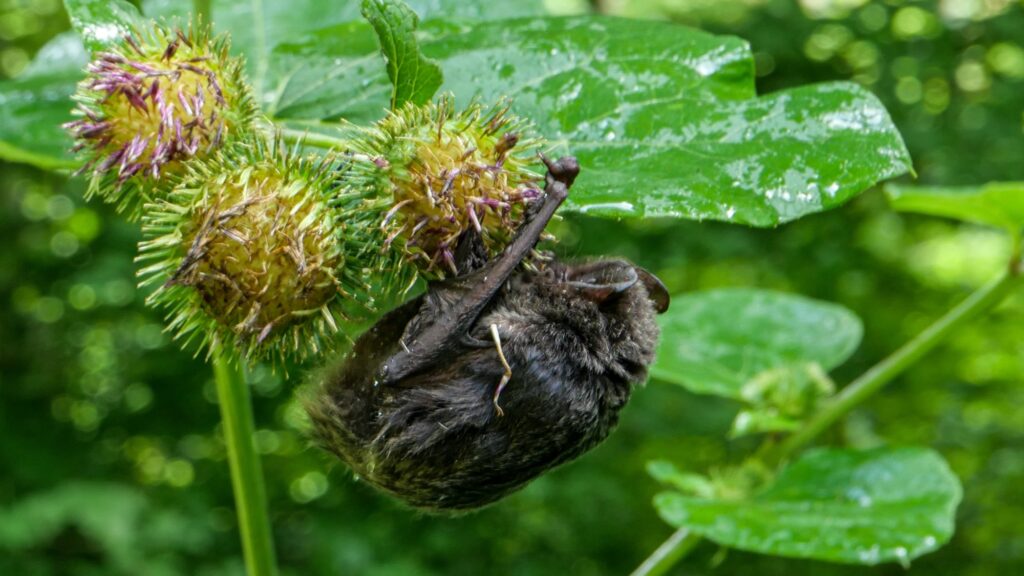 Le soir, nous dînons dans un agréable Biergarten d’une magnifique truite à la cuisson impeccable. En attendant le café, je me mets en quête de savoir quelle espèce de chauve-souris passe sa journée endormie sur des plantes comme la bardane. Et là, que lis-je ? « Des observations ponctuelles rapportent le piégeage accidentel de petites chauves-souris, telles que la pipistrelle commune (Pipistrellus pipistrellus), la noctule commune (Nyctalus noctula) ou le murin de Natterer (Myotis nattereri), par les infrutescences sèches et crochues de bardanes (Arctium spp.) et de chardons (Cirsium spp.). Ces crochets peuvent retenir le pelage ou les ailes, entraînant souvent la mort par épuisement ou prédation. Bien que rare, ce phénomène illustre un risque sous-estimé même en milieu ouvert comme forestier. ». Mireille avait raison ! (J’aurais pu m’en douter, elle est abonnée à La Hulotte, quand même !). La pauvre petite chauve-souris était morte par effet velcro, prisonnière de la bardane, ou pire, elle était encore vivante et nous aurions pu la libérer du piège bardanesque. Quelle méprise ! Quelle horrible désillusion !