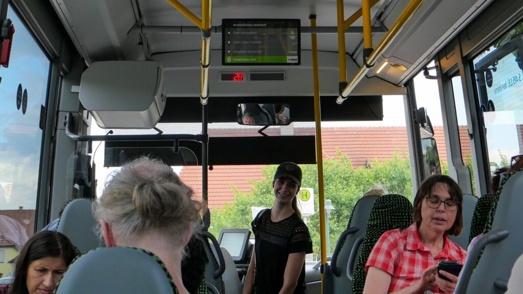 Nous attaquons enfin la très raide descente vers Dürnstein et faisons une dernière pause au milieu des touristes montés voir les ruines du château. Il est bientôt 16 heures, on marche depuis presque 6 heures…l’option bus fait consensus ! Nous nous remettons en route et atteignons l’arrêt avec une marge confortable de 10 minutes qui sera convertie en boules de glace .Le bus est à l’heure ! 18 minutes plus tard, nous débarquons à Krems.