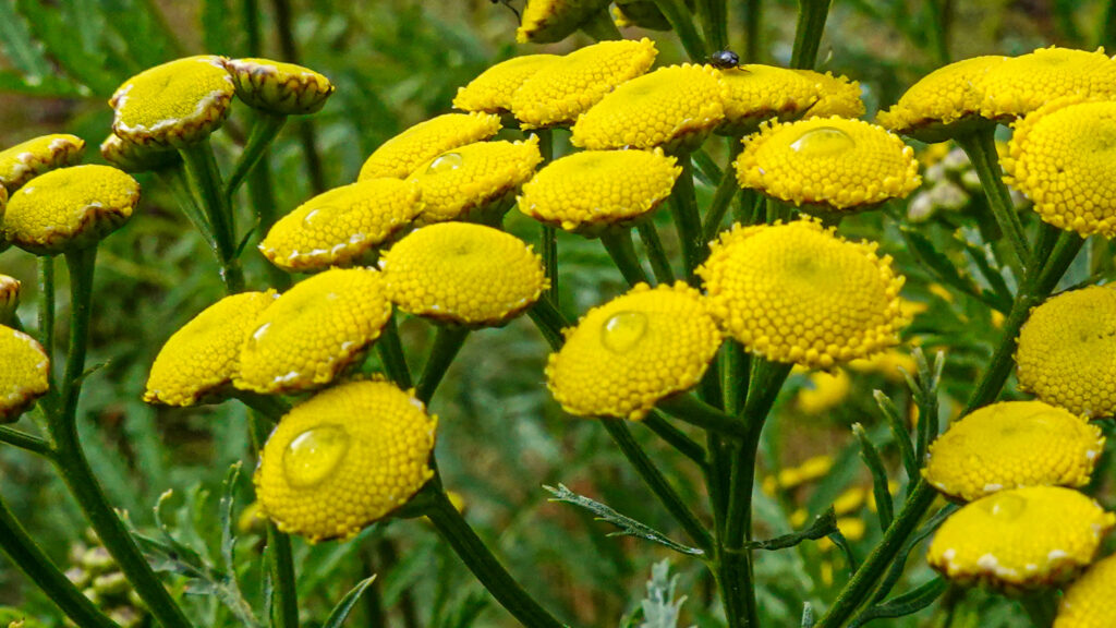 Il a plu une partie de la nuit. La brume couvre les forêts environnantes mais la météo donne des signes d’espoir. Effectivement, après moins d’une heure de marche, le soleil apparaît. Bonne nouvelle, nos pieds pourront sécher. Nous avons en effet cheminé dans une sente herbeuse dont chaque brin nous a offert sa récolte nocturne de gouttes. Quand je pense que Mireille trouvait nos chaussettes encore un peu humides au sortir de l’étendoir !