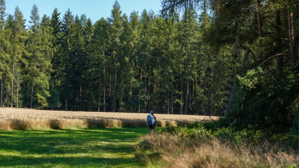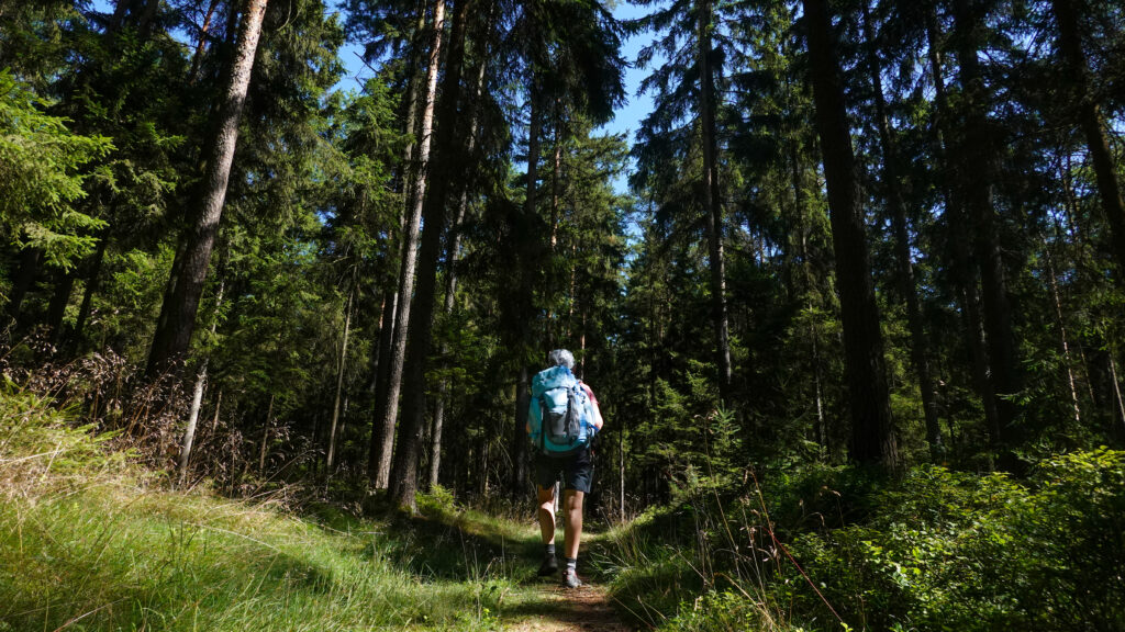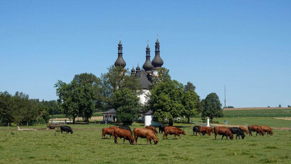 Le ciel est bleu et le chemin est tout confort, recouvert d’une mousse épaisse et d’aiguilles de pin, doté de l’air conditionné à l’ombre des grands arbres, décoré d’une multitude de champignons que la chaleur a fait sortir après les pluies des jours derniers et agrémenté d’intermèdes architecturaux tels que la Kappel, église baroque à trois bulbes, perdue au milieu des champs, ou la somptueuse abbaye cistercienne de Waldsassen. Bref, une bonne journée !